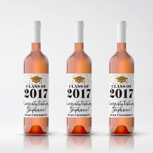 Wine bottle labels for graduation. Free DIY Wine Label Templates for Any Occasion - The Spruce Crafts Special Occasion Bottle Labels. FTD by Design. Here are 6 free wine label templates from FTD by Design for weddings, housewarmings, birthdays, parties, friends, and family dinners. All have very pretty designs in blushes and coppers. These can be downloaded as labels as seen here or tags that you slip over the neck of the wine bottle. Graduation Water Bottle Labels - Add a Little Adventure Download the graduation water bottle labels Design 1 The first design says "Congratulations Graduate!" on the front of the label. Download design 1 here. Design 2 The second design says "Thank you for celebrating with us!" Click here to download design 2. Design 3 The third design says "Congratulations Class of 2021." Download design 3 here. Mini Wine Bottle Labels - Free Printables - Add a Little Adventure There are six mini wine labels per 8.5 x 11 sheet of paper. You can print out as many copies as you need. How to Attach the Mini Wine Bottle Labels The easiest thing to do is print them on sticker paper like this. That way, you can just cut them out with a paper trimmer and peel and stick them onto the mini wine bottles. Wine Bottle Labels for Graduation | Etsy Custom Graduation Label, Graduation Label, Wine Label, Graduation Gift TwistedLabels (288) $7.00 Bestseller Class of 2021 College Graduation Wine Bottle Label, 2021 Graduation Party Wine Gift, Cheers to the Graduate Wine Label, Personalized ohlillydesigns (4,817) $5.59 $7.99 (30% off)